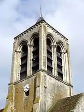 L'impressionnant clocher carré, à trois niveaux d'élévation, est disproportionné par rapport à la taille de l'église, ce qui est surtout mis en évidence par les grandes dimensions des baies abat-son de l'étage de beffroi. Comme les deux portails, cet étage affirme bien son style gothique. Il est d'une conception rigoureuse et très élégant. Son effet est seulement diminué par une flèche en charpente nettement trop basse. L'étage est délimité inférieurement par deux rangs de petites billettes formant damier, et supérieurement, par une corniche très curieuse, où alternent des ovales concaves en biseau, accueillant chacun une billette, et des cercles excavés. Les limites entre deux blocs taillés se situent au milieu des cercles, et c'est ici que sont placés les mascarons sur lesquels repose la corniche. Les angles de l'étage sont flanqués de deux minces contreforts orthogonaux peu saillants, qui sont strictement verticaux, et s'achèvent par un court glacis formant larmier. Les baies et leurs multiples colonnettes à chapiteaux occupent tout l'espace disponible entre deux contreforts, sauf au nord, où il n'y a qu'une seule baie en raison de la présence de la tourelle d'escalier. Fait rare, celle-ci est plus élevée que la tour elle-même, et dessert tous les niveaux jusqu'au comble de la flèche. Chaque baie s'ouvre sous une triple archivolte, et entre six colonnettes à chapiteaux appareillées. La colonnette médiane devant le trumeau central est partagée par les deux baies voisines. Les chapiteaux de ces colonnettes sont sculptés de crochets, et ont des tailloirs composés d'une plate-bande, d'une gorge et d'un tore. Ils reçoivent les voussures de l'archivolte, dont celle du milieu est sculpté de fleurs de violette excavées, tandis que les deux autres sont toriques. Un bandeau doublement biseauté complète chacune des archivoltes, et retombe sur trois têtes saillantes, dont celle du milieu est partagée. Comparé à cet étage richement décoré, l'étage intermédiaire qui le sépare de la base (en l'occurrence, la première travée du chœur), se fait très discret, conformément à l'usage. L'unique fenêtre visible depuis l'extérieur se situe au sud, et sa partie supérieure accueille le cadran d'horloge. Les contreforts à l'est et à l'ouest ne sont pas plus saillants que ceux de l'étage de beffroi, tandis que ceux au nord et au sud comportent de nombreuses retraites par des larmiers et glacis.
