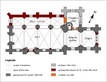 | Autres campagnes de travaux | fin XIIIe siècle (croisillon nord) ; fin XVe siècle - 1510 (bas-côté nord, voûtes de la nef) ; 2e quart XVIe siècle (baie du chevet) |