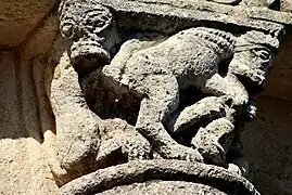 - Un lion bicorporé dont la tête est sur l'angle est de la corbeille et les deux corps sur la face principale et la petite face est. La bête est en traîne d’engouler un homme par les pieds. Cette partie de la corbeille est érodée, mais on peut toujours distinguer la tête, en bas, qui semble être coiffée comme un moine.