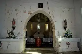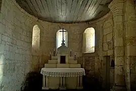 Une seule colonne romane avec un chapiteau d'entrelacs se dresse à droite à l'entrée du chœur. Le sanctuaire, sans ornements, est couvert également d'une charpente, est éclairé par cinq fenêtres.