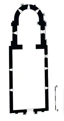L'abside se décompose en sept pans, deux pour le chœur et cinq pour la partie semi-circulaire.