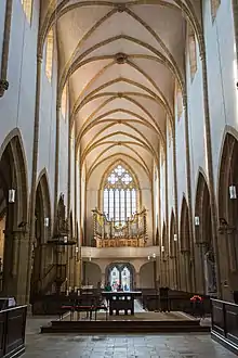 L'église gothique, résolument simple, est à trois nefs sans transept et mesure 73 mètres de longueur et 25 mètres de largeur. Elle ne possède pas de haut clocher, étant une église d'ordre mendiant, mais une petite tourelle. La nef a six travées. Le chœur principal, à quatre travées dépassant à l'orient, est flanqué des deux côtés par des absides de trois travées chacune. Le vaisseau est conçu avec des voûtes nervurées. Un jubé existant à l'origine a été supprimé, de sorte qu'aujourd'hui la vue s'étend du portail au chœur principal. Le maître-autel et la chaire ont été créés au cours de la rénovation néogothique de 1869. On trouve au nord un deuxième portail avec une rosace. Les chapiteaux sont habilement décorés l'un d'eux du côté oriental montre un petit moine agenouillé vêtu de son habit dominicain avec un compas, sa règle et l'inscription « Frère Diemar »[1] ; il s'agit du maître d'œuvre de l'église. Plusieurs figures animalières datant de 1280 environ se trouvent sur le contrefort oriental[2].