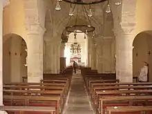 La nef de l'église s'étire sur six travées avec bas-côtés, voûtée en berceau. Chaque travée est renforcée en arcs doubleau retombant sur des demis colonnes s'appuyant sur les murs gouttereaux. La quatrième travée sur laquelle repose le clocher est moins longue, plus basse et repose sur des piliers plus massifs que ceux des autres travées[10].