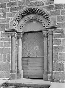 L'aspect extérieur est modeste sans contreforts ni ressauts[7]. La façade occidentale a une porte surmonté d'arcs en plein cintre retombant sur des colonnettes aux chapiteaux sculptés ; le tympan ainsi formé est sans relief et était destiné à être peint. Au dessus de cette porte, une fenêtre agrandie au fil du temps donne un aspect étrange avec ses colonnettes s’arrêtant à mi-hauteur[8]. Une corniche moulurée se trouve sur la face est.