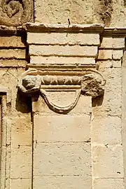Le registre inférieur, très haut, ne présente aucune ornementation, alors que le registre supérieur est percé de trois fenêtres cintrées et orné d'arcades retombant sur de petits culots ornés de motifs géométriques variés (croix, stries verticales, stries horizontales). Cette arcature est surmontée d'une corniche biseautée.