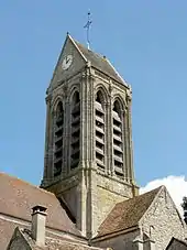 Le clocher constitue l'élément le plus remarquable de l'édifice et donne l'image d'une grande légèreté. Son étage, de hauteur considérable, est percé sur chaque face de deux baies gémelées en arc brisé sur toute sa hauteur. Les angles de l'étage sont occupés chacun par une fine colonnette au chapiteau sculpté simplement en feuillages. Deux colonnettes du même type cantonnent de chaque côté les quatre faces de l'étage, et une colonnette divise chaque face en deux parties égales, ce qui donne vingt-huit colonnettes au total. Les baies abat-son possèdent chacune une double archivolte avec des colonnettes toujours du même modèle, supportant la voussure faite de gros tores, et surmontée d'un cordon en dents de scie. Une corniche de corbeaux termine l'étage du clocher. Dans son ensemble, le clocher de Grisy-les-Plâtres marque l'apogée de l'art gothique dans la région. Il se place à la fin d'une ligne de développement entamé par le clocher central de l'église Saint-Quentin de Nucourt et qui a donné le clocher d'Auvers-sur-Oise comme représentant le plus connu. À Auvers, le type général s'est déjà bien cristallisé, mais l'étage de beffroi est peu élevé et donne un effet trapu. Les colonnettes sont nettement moins nombreuses et les angles sont occupés par des colonnes assez épais. Bien que ce clocher soit considéré comme un exemple très réussi, il n'atteint pas l'élégance du clocher de Grisy-les-Plâtres. Après la guerre de Cent Ans, les premiers clochers gothique flamboyant dont notamment celui d'Hérouville se calquent toujours sur le même modèle global, sans plus jamais atteindre la même perfection. Indépendamment des considérations esthétiques, le clocher de Grisy-les-Plâtres a présenté des problèmes de stabilité, qui ont motivé la pose d'un contrefort biais à l'angle sud-est, et la construction d'un arc de décharge dans le mur occidental du croisillon sud[3].