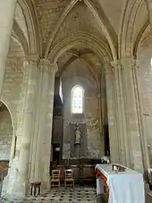 Si les croisillons reprennent le profil des ogives de la nef, ainsi que la même logique pour l'agencement des supports du côté de la croisée, une simplification est intervenue aux extrémités nord et sud. Ici, une seule colonnette logée dans les angles reçoit à la fois une ogive et deux formerets. Sous les formerets, les murs orientaux présentent des niches de très faible profondeur voûtées en berceau. Bernard Duhamel pense qu'il s'agit du signe d'un agrandissement projeté mais finalement non réalisé. Mais de telles niches sont tout à fait courantes, et le chœur, contemporain du reste de l'église, n'est pas conçu pour être accompagné de bas-côtés. Il aurait donc dû s'agir d'absidioles, qui ne sont en principe plus à la mode au début du XIIIe siècle. Contrairement à la nef et aux bas-côtés, les murs des croisillons n'ont pas été décapés, et un décor en faux appareil subsiste au nord, alors que le croisillon sud est peint en bleu nuit avec de petites étoiles dorées, décor moderne aujourd'hui très dégradé. Les fenêtres du croisillon nord sont des lancettes simples en tiers-point ; celles du croisillon sud sont en plein cintre et curieusement non centrées. Ici des bandeaux ornent les murs au niveau des impostes[3].