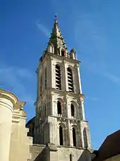 La haute flèche en pierre cumule à 40 m. Le premier étage est flanqué de gros massifs de maçonnerie aux quatre extrémités, épaulés en plus par des contreforts peu saillants. Les angles du second étage sont par contre occupés par de fines colonnettes, et des colonnes plus épaisses remplacent les contreforts. Des colonnes du même type divisent les faces du clocher en deux segments. Toutes ces colonnes ont remplacé celles d'origine vers le début du XVIe siècle. Chaque segment des faces du clocher est percé d'une baie plein cintre, s'inscrivant dans des archivoltes nettement plus larges : deux colonnettes garnies de chapiteaux sommaires se poursuivent par un gros tore de même diamètre, entourant l'arcature. Les tailloirs des chapiteaux se poursuivent à l'intérieur par des impostes, car les baies proprement dites sont dépourvues de colonnettes et de chapiteaux. Les deux étages romans sont largement identiques, mais le second est moins haut et possède en même temps des baies légèrement plus larges. Le second étage se termine par un entablement, ajout du début du XVIe siècle tout comme les colonnes. Presque quatre siècles séparent le troisième étage des étages romans, mais puisque le second et troisième étage présentent des colonnes du même type et puisque toutes les baies sont en plein cintre, l'on ne note aucune rupture stylistique brutale. La flèche octogonale en pierre est garnie de crochets et entourée de quatre clochetons pleins dans le style de la Renaissance, comportant quatre niches plein cintre cantonnées de pilastres. Entre deux clochetons, une lucarne laisse entrer le jour ; également décorées de pilastres, ces lucarnes présentent des frontons triangulaires[22],[26].