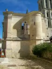 Moins que par l'église et par son clocher placé en retrait, la vue est captée par le portail Renaissance commencé par l'architecte Nicolas Le Mercier en 1560. C'est l'unique partie achevée du projet d'extension de cette époque. Le double portail est surmonté d'un tympan garni d'un bas-relief représentant l'arrivée de Jésus au jardin des Oliviers et l'abandon par ses disciples. Deux colonnes corinthiennes de chaque côté, qui commencent seulement à deux mètres du sol, supportent l'architrave avec sa frise au rinceau de feuillages. Flanquée de vases, la niche à statue tout en haut reste vide. À gauche et à droite du portail, s'ouvrent des baies plein cintre avec un remplage constituée de deux arcades surmontées d'une mouchette. Une frise de triglyphes court en haut des murs et se poursuit sur les deux contreforts cantonnant la façade. Ces derniers sont couronnés par des pots-à-feu. Le mur occidental du second bas-côté sud a également été construit, faisant équerre avec la façade décrite. Elle présente une baie identique à celles décrites, mais l'unique contrefort à gauche est moins élaborée. Une courte tourelle d'escalier flanque le mur immédiatement à droite de la fenêtre. Comme le prouve l'existence de ce mur, les dimensions de la nouvelle nef et de ses bas-côtés devaient correspondre plus ou moins à celles du chœur, également plus large que profond. Sur les faces opposés des murs visibles depuis le vestibule ouvert, l'on peut voir de grosses colonnes maçonnées portant d'imposants chapiteaux et des colonnettes cannelées, ainsi que les départs des nervures des voûtes jamais construites. Au XIXe siècle, dans le cadre d'un abaissement du sol, le trumeau a été supprimé et remplacé par un linteau monolithe. Les deux arcades du portail ont été dotées d'un remplage de style gothique, qui détonne complètement au sein de cette œuvre de la Renaissance[25].