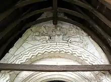 Le portail datant de la première moitié du XIIe siècle est protégé par un auvent en charpente du XVIe siècle, au gâble aigu. Le porche en arc en plein cintre est encadré de voussures au décoré de lignes brisées. Il est surmonté d'un tympan sculpté représentant le Christ en majesté au milieu du Tétramorphe (représentation symbolique des quatre Évangélistes).