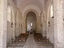 La nef est à trois travées, carrées pour les deux dernières, un peu plus longue que large pour la première. Les deux premières, construites au XIe siècle ont été un peu rehaussées au XIIe siècle au moment de la construction du reste de la nef. Sur les deux premières travées, une arcature a été alors appliquée au mur sans doute en vue de la pose d'une voûte qui n'a jamais eu lieu. Les pilastres en sont en grand appareil de pierres à champ étroit, d'une épaisseur de 4 cm à 7 cm[10]. Ces deux premières travées sont couvertes d'une charpente et il est visible que la charpente précédente était plus basse. La nef a été rehaussée durant la guerre de Cent Ans, ce qui précédait habituellement l'installation d'un chemin de ronde. La troisième travée est voutée en berceau plein-cintre.