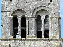 C'est une des rares églises à avoir conservé son clocher roman d'origine. Ce clocher carré, à un seul étage, au toit à pans coupés, est couvert de tuiles. Chaque face était ouverte de baies géminées de plein cintre, mais seules celles des faces nord et sud ont été conservées. Pour chaque baie, les arcs retombent sur une colonnette centrale soutenue par une base ornée. Le clocher qui présente une division horizontale, a gardé les modillons de l'ancienne corniche.