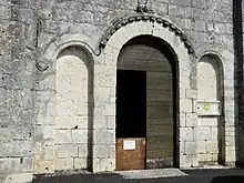 La façade occidentale est surmontée d’un fronton triangulaire. Une corniche qui relie deux contreforts plats est soutenue par des modillons représentant des têtes d‘hommes, les uns barbus, les autres imberbes. Le portail central à simple rouleau dont l'arc est orné d'un cordon à billettes présente au-dessus de son extrados un haut-relief sculpté très endommagé qui pourrait être un agneau romain en réemploi. Ce portail est encadré par deux arcades aveugles et surmonté d'un oculus[8]. Cette façade est à division verticale et division horizontale, ce qui est rare (2,6 %) dans les églises romanes de l'Angoumois [10]