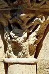 Le modillon à sa gauche présente également un monstre ricnaant.