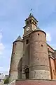 C'est donc à l'année 1606 mentionnée sur l'une des tours qu'il faut rapporter non seulement les tours, mais encore les bas-côtés, le pignon du bras méridional du transept, et les restaurations en brique du donjon. Sauf ces raccords, le donjon a été construit en même temps que le corps de l'église ; et c'était déjà, avant l'adjonction des tours, un ouvrage défensif: la meurtrière le prouve, car elle est percée dans les portions de mur qui n'ont pas été retouchées.