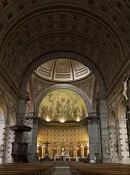 Dans le chœur, les voûtes semi-sphériques contiennent trois peintures murales d'Auguste Perrodin, ancien collaborateur de Eugène Viollet-le-Duc. Au centre, le Christ bénissant est assis dans sa gloire, avec à sa droite saint Paul, saint Denis, Rustique et Éleuthère, et à sa gauche des martyrs lyonnais. La voûte à gauche montre l'Apparition du Sacré-Cœur à Marguerite-Marie Alacoque. La voûte à droite, saint Dominique recevant le Rosaire des mains de la Vierge, avec sainte Catherine de Sienne en extase devant l’Enfant Jésus[12].
