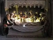 Intérieurement, les chapiteaux sont sculptés de scènes religieuses mais il s'y trouve également des personnages du Roman de Renart[3]. Dans l'absidiole méridionale se trouve un retable du XVIIe siècle et le mur du fond du collatéral méridional est occupé par une sculpture représentant la Mise au tombeau[4].