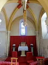 - Un grand Christ en croix en bois et terre cuite (œuvre de la manufacture de Vendeuvre-sur-Barse), suspendu sous l'arc-doubleau ouvrant dans la dernière travée du chœur, subsiste sans doute de l'ancienne poutre de gloire. Aux quatre extrémités du crucifix, les médaillons sous la forme de quatre-feuilles et représentant les quatre symboles du Tétramorphe sont particulièrement bien conservés. L'œuvre a récemment bénéficié d'une restauration.