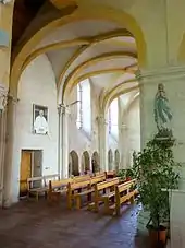 - Une statue en pierre polychrome fortement mutilée, sans tête ni mains, est placée sous la première arcature du collatéral nord.