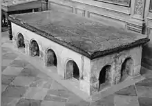 Le cénotaphe de la sainte - une large dalle funéraire de pierre de Tournai sur laquelle figure une moniale - est la pièce centrale de la chapelle. La dalle est soutenue comme une table par douze pieds en arcatures. La dalle, malgré l’inscription 'SCTA HELENA', est de loin postérieure à la mort de la sainte, et fut sans doute placée dans la chapelle après la canonisation de Sainte Alène vers 1193. Le cénotaphe fut créé pour la satisfaction des pèlerins qui visitaient le sanctuaire de la sainte.
