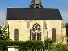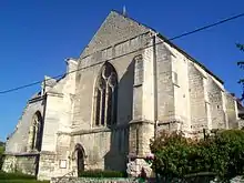 Une tourelle d'escalier se dresse à l'angle nord-ouest du chœur. Elle n'a jamais été complètement achevée car ne comportant pas de couronnement. Une corniche composée simplement d'un bandeau et d'un tore termine le mur gouttereau occidental et la tourelle, et se poursuit sur le mur pignon septentrional du chœur. L'élévation du chevet n'offre aucune particularité ni décoration, sauf ce qui semble être le vestige d'un enfeu voûté en anse de panier, dans le soubassement de la baie du vaisseau central. Les contreforts sont les éléments déterminants de cette façade. Ils comportent une retraite avec larmier au niveau du seuil des fenêtres, se poursuivant sur tout le chœur, ainsi qu'un court glacis intermédiaire et un long glacis final. Le contrefort à droite de la façade méridionale est identique, alors que celui à gauche de la même façade a été modifié comme indiqué. Le portail méridional s'ouvre sous une double archivolte torique surmontée par un sourcil se continuant sur les impostes, et reposant sur les tailloirs polygonaux de quatre chapiteaux de feuillages, mal conservés. Les fûts de colonnes et leurs bases ont disparu. C'est par cette porte que l'on accède habituellement à l'église[18].
