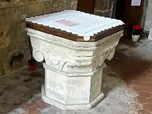 - Les fonts baptismaux en pierre calcaire, du XIIe siècle, sous la forme d'une cuve baptismale à infusion. Sur ses angles, elle est ornée de volutes composées de deux filets encadrant des pointes de diamant. Les faces de la cuve font apparaître des masques humains ou des fleurs[20] ;