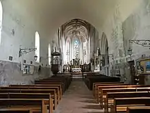 À l'intérieur, la nef est recouverte d'une fausse voûte en berceau de bois et plâtre légèrement brisé, et la décoration fait entièrement défaut. La disproportion de la nef avec le chœur est flagrante, tant sur le plan de la hauteur que sur le plan de la longueur. Comme pour d'autres églises dans le même cas, ce constat est généralement expliqué par la répartition des frais de construction et des charges d'entretien entre les gros décimateurs pour les parties orientales, et les paroissiens pour la nef, et, le cas échéant, pour le clocher. Souvent les paroissiens ne parvenait pas à réunir les fonds nécessaires pour édifier une nef d'une allure plus représentative. Des pierres de réserve dans le mur occidental du collatéral nord du chœur et l'ébauche d'une arcade dans ce même mur témoignent d'un projet de remplacement de la nef romane au XVIe siècle. Il reste à signaler l'arcade bouchée vers la base du clocher, qui est en arc brisée et moulurée de deux larges gorges. Devant le mur, l'on trouve ce qui évoque une ancienne cheminée, et qui sert de support à une Charité de Saint-Martin[2].