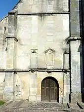 La façade occidentale ne concerne que la nef et le bas-côté, le clocher faisant légèrement saillie et forme une entité indépendante. Le mur est épaulé par un haut contrefort amorti par un glacis à l'intersection entre les deux vaisseaux, et par un second contrefort à l'angle nord-ouest. Ces contreforts sont scandés, ainsi que la façade, par un bandeau mouluré accompagné d'un larmier en doucine, qui court à plus de deux mètres du sol. S'y ajoute un bandeau analogue en dessous du glacis sommital des contreforts, ainsi qu'à deux tiers de la hauteur du contrefort central. Comme sur les autres élévations, les murs sont enduits, à l'exception des premières assises près du sol, des contreforts, des chaînages et des pourtours de la plupart des ouvertures, qui sont réalisés en pierres de moyen appareil. Le portail paraît extérieurement comme étant en plein cintre, alors qu'elle semble être rectangulaire depuis l'intérieur. Il est flanqué de deux pilastres nus, qui butent contre le bandeau horizontal déjà signalé : point d'entablement ou de fronton. La façade aurait été reprise à une époque indéterminée selon le dossier d'inventaire. Cette reprise ne paraît pas certaine, considérant que le bandeau est également présent sur les contreforts du bas-côté nord, et que les deux niches au-dessus des pilastre conservent des vestiges de dais flamboyants. Tout au plus, la niche centrale au-dessus de la porte avec son petit fronton triangulaire et sa coquille Saint-Jacques paraît elle plus récente, mais elle a été entièrement refaite lors d'une restauration. Il n'y a pas d'autre forme d'ornementation, et pas de fenêtre, seulement d'étroites ouvertures rectangulaires dans le demi-pignon du bas-côté et le haut pignon de la nef[4].