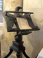 - L'aigle-lutrin en bois anciennement doré date du XVIIIe siècle, et est classé depuis 1912. Il mesure 175 cm ou 210 cm de hauteur, le dossier de protection et le dossier d'inventaire ne concordant pas sur ce point. Trois tiges de bois en volutes rentrantes servent de support à la boule (orbe) de l'aigle. Elles s'appuient sur une planchette triangulaire, et vers l'intérieur, elles sont sculptées d'une patte de lion[20].