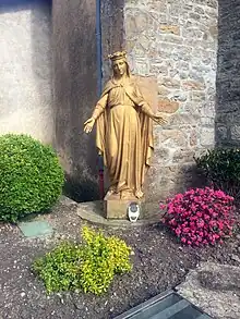 À noter, qu'à l'extérieur se trouve une statue de la Vierge, en métal, d'environ 2 m[a 5] ; par le passé, elle était accrochée à la façade de l'église[a 5].