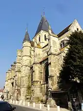 Le croisillon sud a été remanié à l'occasion de la construction du nouveau chœur, à la fin du XVe siècle. Une grande fenêtre au remplage flamboyant a été aménagée au niveau du rez-de chaussée. Tout en haut, une rosace à huit festons aux têtes tréflées procure un éclairage supplémentaire. Le mur méridional est flanqué à gauche d'un contrefort très saillant et strictement vertical entrecoupé de plusieurs larmiers, et à droite, par une tourelle d'escalier octogonale donnant accès aux combles. Le chœur flamboyant a d'emblée été muni d'arcs-boutants, qui retombent sur des contreforts recouverts de chaperons. Ces contreforts sont couronnés de pinacles, et les gargouilles prennent la forme d'animaux fantastiques. Par ailleurs, dans la région, le chœur est l'un des rares exemples de réalisations postérieures au XIIIe siècle comportant des fenêtres hautes. Le chevet plat est percé d'une vaste baie de dimensions impressionnantes, occupant pratiquement toute l'extrémité orientale du vaisseau central. Le remplage se compose de quatre lancettes aux têtes tréflées, surmontées par des soufflets et mouchettes[4].