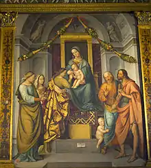 Le polyptyque Les noces mystiques de Sainte Catherine, chef d’œuvre de Francesco Verla, daté de 1512, est une œuvre complexe où l'on reconnaît trois parties distinctes ; la prédelle, en bas, représente trois épisodes de la vie de Sainte Catherine (Le Jugement, Le supplice de la roue et La décapitation), avec au second plan le dessin d'une église (peut-être Saint-François de Schio!) et d'un château, probablement celui de Schio. La scène centrale de la pala est soutenue par deux pilastres sur fond doré décorés de candélabre et de diverses chimères. Le panneau central représente, au milieu d'un décor typiquement renaissance, Sainte Catherine agenouillée recevant l'anneau nuptial de Sainte Marie et l'enfant, assis sur un trône. D'autres saints complètent la scène : Sainte Agathe et Sainte Lucie sur la gauche, Saint Joseph et Saint Jean Baptiste à droite. Des festons de cornes d'abondance portent des fruits.