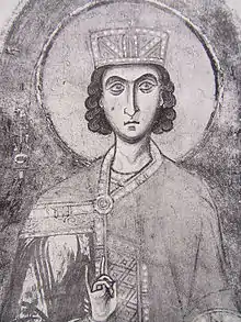 La fresque la plus originale, et qui se trouve près de l'autel, près du diaconicon, l'endroit où sont conservés les vases sacrés (diakonik) est celle de Saint-Georges et du miracle de sa victoire sur le dragon. On y observe une recherche de mouvement et un pittoresque exceptionnel pour son époque. Tel un Persée chrétien, Saint-Georges fonce, la lance en avant, vers le dragon qui s'apprêtait à dévorer la princesse[10]. Cette fresque montre à quel point les maîtres fresquistes qui travaillent sur ces surfaces de murs sont attachés à l'idée suivant laquelle les fresques sont indissociables des murs. Elles vivent d'une même vie que les murs. La figure de Saint-Georges à cheval se trouve développée sur la partie plane du mur pour ne pas être soumise à des déformations de perspectives. De côté, là où les murs sont courbes, le fresquiste a représenté un haut bâtiment et, en direction de ce bâtiment, la ligne d'une courbe ascendante de la colline. Cette ligne relie l'élément central aux éléments latéraux, et apporte une cohérence optique à l'ensemble. Il est probable qu'une ligne semblable se dirigeait à gauche. Cette ligne bien nette et précise est le principal moyen d'expression des auteurs. Elle exerce la fonction principale partout : dans le détail des visages, dans le contour des silhouettes , dans les motifs ornementaux. Les vêtements sont articulés en menus plis, créant des lignes droites, des angles aigus, des zigzags, des courbes. On perçoit partout l'exaltation du jeu des lignes dans la représentation de ces vêtements. Ces lignes sont tracées par une main experte de manière vraiment calligraphique. Le profil du cheval de Saint-Georges en est un exemple particulièrement expressif[11].