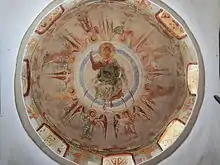 Il n'est pas possible, avec ce pourcentage subsistant, de donner une image d'ensemble de la peinture originale de murs. Mais on peut comprendre, qu'à l'origine, les murs nord et sud étaient recouverts de cinq registres de fresques. De celles des murs est et ouest il ne subsiste rien. Par contre, les fresques intérieures de la coupole sont presque intactes. Celles qui représentent l'Ascension de Jésus, entouré des apôtres, des prophètes et d'anges sont les mieux conservées[1]. Comme le veut la tradition la coupole est dominée par cette Ascension d'un Jésus-Christ Pantocrator ; les archanges Michel et Gabriel tenant le globe et le sceptre se partagent des absidioles latérales, sur les murs occidentaux se devinent les vestiges d'un Jugement dernier[6]. Dans le diakonik, la grande composition monumentale de Saint-Georges et le dragon est fragmentaire mais permet d'imaginer la composition initiale.