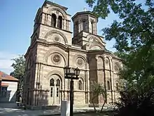 Elle s'inscrit dans un plan tréflé et se présente comme un édifice à nef unique surmonté d'un dôme octogonal reposant sur un tambour carré ; un clocher domine la façade occidentale ; la nef est précédée d'un narthex et la zone de l'autel s'élargit de chapelles latérales[2]. Les façades sont riches d'éléments architecturaux et plastiques, parmi lesquels on retrouve notamment des entrelacs byzantins ; le décor plastique se concentre autour des fenêtres, sur le dôme et sur le clocher ainsi que dans la corniche du toit, sous laquelle court une frise avec des motifs floraux[2]. Parmi les autres éléments de décoration figurent des cordons qui rythment horizontalement les façades et des archivoltes richement ornées dans lesquelles s'inscrivent des rosettes[2].
