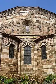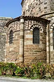 Elle est encadrée de deux chapelles rayonnantes dont les maçonneries sont rythmées par des colonnes engagées polychromes. Les fenêtres de ces chapelles présentent également des claveaux noirs et blancs et sont surmontées de mosaïques de pierres polychromes figurant des fleurs, des losanges des zigzags ou des cercles.
