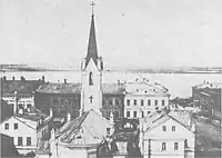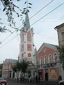 L'église souffre de l'incendie qui frappe la ville en 1875, mais elle est restaurée promptement et l'on construit en plus deux annexes, l'une pour la maison du pasteur, l'autre la maison paroissiale. La paroisse compte trois cents fidèles en 1878.