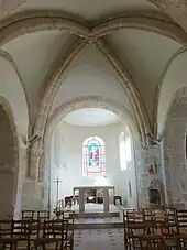 Dans la première travée du chœur, le rouleau supérieur du doubleau vers la base du clocher retombe sur des piliers engagés au plan d'un quart-de-cercle, sur lesquels les impostes déjà signalés se continuent. La voûte, largement analogue à la précédente, est plus sensiblement bombée. Ses tores sont séparés par une mince arête et non d'un filet, et ses ogives ne retombent pas sur des culs-de-lampe, mais des colonnettes à chapiteaux implantées obliquement. Au moins c'était le cas avant la guerre de Cent Ans. Depuis, le chapiteau seul subsiste dans l'angle nord-ouest, la partie inférieure du fût et la base manquent dans l'angle nord-est, et les supports d'origine ont totalement disparu du côté sud. Les chapiteaux sont du même type que dans la nef, et sculptés de deux rangs de feuilles d'eau plates à volutes d'angle. En outre, la voûte est munie de formerets toriques tellement peu saillants au nord et au sud, qu'ils ne justifient pas de supports dédiés. L'on peut imaginer que de tels formerets existaient primitivement au nord et au sud de la base du clocher, sans que ce soit incompatible avec l'absence de colonnettes à chapiteaux dans les angles. Seulement le formeret oriental est un peu plus prononcé, et par ailleurs en plein cintre, sans doute parce que la construction de l'église a commencé par le chevet. Au nord, il retombe sur un tailloir incomplet, et il semble faire corps avec le doubleau non mouluré ouvrant sur l'abside. On ne peut donc pas exclure qu'une abside existait déjà à la période romane, mais les contreforts orientaux des murs latéraux du chœur pour moitié engagés dans les murs de l'abside suggèrent le contraire, si l'on veut suivre l'argumentation adoptée par Lefèvre-Pontalis pour la chapelle latérale sud. Pour venir aux arcades latérales ouvrant dans la deuxième travée des chapelles, elles sont nettement moins larges et moins élevées que les dimensions du chœur ne le permettraient. Dépourvus de mouluration et de colonnettes à chapiteaux, elles ont les angles chanfreinés, et l'arcade septentrionale est munie d'impostes rudimentaires. Quant à la piscine flamboyante au sud-est, elle semble taillée dans un seul bloc, et est constituée d'une niche s'ouvrant sous une arcature trilobée, dans le lobe central est entièrement fermé. Enfin, l'abside n'offre rien d'autre que deux fenêtres en anse de panier géminées au nord et au sud, une grande baie en plein cintre au chevet, et un plafond plat décoré de quelques moulures. Eugène Lefèvre-Pontalis est persuadé de l'existence ancienne d'une voûte en cul-de-four[8]
