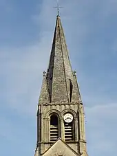 La flèche, particulièrement élancée, est une pyramide aigüe à huit pans. Ils sont séparés par des tores, non ajourés, et entièrement sculptés de dents-de-scie en bas-relief. Afin de permettre la transition du plan quadrangulaire de la tour vers le plan octogonal de la flèche, des trompes ont été aménagées en haut des quatre angles de l'étage de beffroi. Conformément à l'usage, qui n'a pas été respecté à Boubiers et Tessancourt-sur-Aubette, la flèche est cantonnée de quatre pyramidons, qui sont ici de plan carré, et sinon décorés pareillement que la flèche. Ils sont en outre coiffés d'un fleuron. Eugène Lefèvre-Pontalis dit que les clochetons sont généralement établis sur plan triangulaire, ce qui est le cas à Béthisy-Saint-Martin, Chamant, Courcelles-sur-Viosne, Gadancourt, Nesles-la-Vallée, Reilly, Saint-Gervais, Saint-Vaast-de-Longmont. D'autres flèches semblables, dont Ennery, Gaillon-sur-Montcient, Jouy-le-Moûtier et Santeuil, sont toutefois entourées de clochetons coniques. Parmi ces flèches, Béthisy, Chamant, Courcelles-sur-Viosne, Gadancourt et Gaillon sont partiellement ajourées, et donc potentiellement moins anciennes. Parmi les flèches non ajourées, les fleurons au sommet des pyramidons ne se trouvent qu'à Hardricourt et Nesles-la-Vallée. Ce sont probablement les plus récentes du groupe, car cet ornement se rattache au style gothique. Il convient de classer dans un autre groupe les flèches munies de lucarnes et cernées par des lanternons, comme on peut en voir à Limay, Mogneville, Néry et Saint-Leu-d'Esserent, par exemple. Elles ne sont pas antérieures à la fin du XIIe siècle[9],[10].