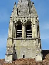 Les artisans du second quart du XIIe siècle ont appareillé le clocher avec grand soin et employé des matériaux de bonne qualité, ce qui lui assure, selon Eugène Lefèvre-Pontalis, encore une longue existence. La tour compte trois étages, à savoir la base voûtée d'ogives, tenant lieu de croisée du transept ; un étage intermédiaire en grande partie noyé dans les combles ; et l'étage de beffroi, le seul qui est entièrement visible depuis l'extérieur, et en même temps principal ornement de l'église et lieu d'être du clocher. Suit la haute flèche de pierre. La cage intérieure du clocher mesure 3,01 m sur 2,93 m. L'étage intermédiaire présente deux arcs de décharge et deux portes en tiers-point, qui établissent l'intercommunication entre la cage et les combles. Le tracé en tiers-point de ces portes est conforme au tracé des voûtes au rez-de-chaussée, mais en raison des préférences esthétiques au second quart du XIIe siècle, l'architecte revient vers le plein cintre pour les baies de l'étage de beffroi, en imitant la plupart de ses confrères (sauf à Néry, Saintines…). Toujours conformément à l'usage à la période romane, qui connaît ici de nombreuses entraves à la règle, les contreforts s'arrêtent en haut de l'étage intermédiaire, et laissent donc libres les angles de l'étage de beffroi, où des colonnettes d'angle prennent le relais. Comme particularité, il n'y a de contrefort qu'au nord et au sud, faces qui devaient rester libres de constructions annexes selon le projet initial. Côté ouest, les contreforts auraient fait saillie dans la nef, ce qui est souvent le cas dans des églises où la nef est plus ancienne que le clocher. Côté est, les contreforts auraient dû reposer sur les murs de la première travée du chœur, ce qui n'empêche pas certains clochers romans, comme Limay, de disposer de contreforts du côté est. Les contreforts s'amortissent par un long glacis deux assises en dessous du bandeau, mouluré d'un listel, d'un tore et d'une doucine, sur lequel prennent appui les baies de l'étage supérieur[9],[10].