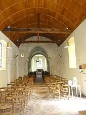 La nef est une simple salle rectangulaire, qui séduit néanmoins par la vue dans le sanctuaire qu'elle offre du côté est, et par sa belle charpente en carène renversée lambrissée, de sorte à former une voûte en berceau en cintre surbaissé. De tels lambris se trouvent également à Bailleval, Frouville, Gonesse, Labbeville, Mogneville. Tout sauf rares au XVIe siècle, ils deviennent souvent les victimes du changement des goûts par la suite, et sont recouverts de plâtre pour suggérer des voûtes en pierre à la période classique, ou remplacés par des voûtes néo-gothiques au XIXe siècle. Seuls les trois entraits avec leurs poinçons sont visibles de la charpente proprement dite. Assez discrètes se font les grandes arcades bouchées au nord, mais elles sont toujours bien visibles et parfaitement conservées. L'on peut conjecturer qu'elles avaient leurs pendants au sud, mais dans les églises gothiques non voûtées dans le milieu rural, la symétrie n'est pas non plus systématique, comme le montrent Bailleval, Le Perchay, Ronquerolles. Ce n'est pas rare non plus qu'un bas-côté soit démoli en raison de son délabrement, notamment aux XVIIIe et XIXe siècles, comme par exemple à Breuil-le-Vert Clairoix, Cramoisy, Heilles, Mogneville, Rieux. Les arcades ne sont pas moulurées. Elles retombent sur des tailloirs carrés profilés d'une plate-bande, d'un listel, d'un tore et d'un cavet en forme de doucine. Ceux-ci sont engagés dans le mur au début et à la fin des arcades, et forment corps avec des chapiteaux sculptés de feuilles d'eau à l'intersection des travées. Ces chapiteaux évoquent la nef de Tessancourt-sur-Aubette et le rond-point de l'abside de Meulan. Les fûts de colonnette de ces chapiteaux sont assez minces, et non monolithiques comme on pourrait le penser, mais appareillés. Les bases affichent un petit et un gros tore aplatis, et sont flanquées de griffes aux angles. Eugène Lefèvre-Pontalis souligne qu'il doit s'agir de l'un des tout premiers emplois des piliers cylindriques isolés pour les grandes arcades, qui retombent généralement sur des piliers rectangulaires, cruciformes ou cantonnés de colonnettes à l'époque de construction. À peine plus jeunes sont les arcades semblables de Tessancourt. Aujourd'hui, les murs qui bouchent la première et la troisième arcade sont ajourés d'une fenêtre en anse de panier, et des fenêtres semblables leur font face au sud, de part et d'autre de l'ébrasement rectangulaire du portail latéral en plein cintre situé dans la deuxième travée[3].