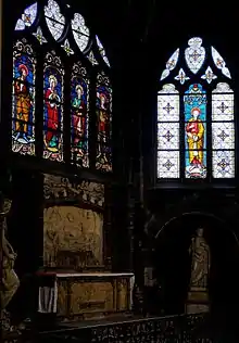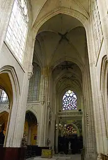Au XIIIe siècle, vers 1220-1230, est réalisé le portail occidental[17], et la chapelle de la Vierge, vaste chapelle qui occupe le second collatéral sud de l'église actuelle et qui renfermait l'autel paroissial.