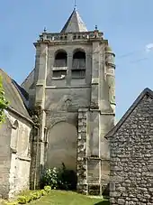 Le clocher se compose de sa base, utilisée comme sacristie et accessible depuis le collatéral sud du chœur ; de l'étage de beffroi ; et d'une flèche octogonale peu élevée, qui est en charpente et couverte d'ardoise, mais prend appui sur deux ou trois assises de pierres de taille. À chaque angle, le clocher est flanqué de deux contreforts orthogonaux, et non d'un unique contrefort biais, ce qui est plus fréquent à partir du milieu du XVIe siècle. Les contreforts se retraitent par un glacis à mi-hauteur, ainsi que par un glacis formant larmier au niveau du seuil des baies abat-son. Ils sont en outre décorés par deux bandeaux au niveau du rez-de-chaussée, qui comportent notamment un tore, ce qui est atypique pour l'architecture postérieure à l'époque gothique rayonnante.