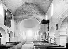 Même par un jour de plein soleil, la nef est sombre comme une tombe. L'on y voit juste assez pour trouver son chemin et repérer sa chaise. Le regard est automatiquement attiré par le sanctuaire, illuminé par le jour qui entre par les cinq baies de dimensions moyennes. Cet effet est sans doute voulu, car la liturgie se pratiquait en regardant en direction de l'orient, et les églises étaient traditionnellement orientées, sauf en cas de contraintes topographiques. Bien que les murs de la nef soient blanchis, le recours à l'éclairage artificiel est donc indispensable. Mais celui-ci est parcimonieux et limité aux bas-côtés, la nef n'étant éclairée qu'indirectement. Les grandes arcades sont ainsi mises en valeur, ce qui produit un effet graphique intéressant. C'est, avec l'harmonie des proportions, l'un des piliers sur lequel repose l'esthétique de la nef, qui, selon Dominique Vermand, est d'une sobre élégance. La régularité des grandes arcades et de la répartition des fenêtres évite les tensions et est perçue comme apaisante. En même temps, la structure quelque peu diffuse de la charpente, plongée dans l'ombre, évite la monotonie qu'apportait jadis la fausse voûte en berceau. Avec cette charpente apparente, l'architecture de l'église n'est pas faite pour éblouir. L'absence de mobilier autre que les chaises traduit le retour à l'essentiel, et en supprimant toute source de distraction, favorise le recueillement. La décoration se limite à de discrètes peintures murales en ocre rouge et jaune, aujourd'hui en grande partie effacées, et qui ont échappé à l'attention de tous les auteurs. La même ambiance devait régner à la période romane, sauf qu'il n'est pas certain que des vitraux peints en grisaille existaient déjà. Avec une longueur de 11,60 m et une largeur de 6,00 m environ, la nef représente une superficie d'approximativement 70 m2 et peut accueillir une centaine de personnes assises, soit la totalité des habitants du village[27].