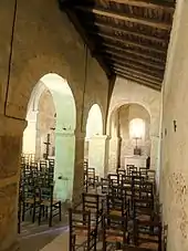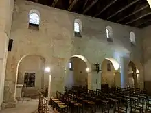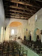 Chacun des deux murs latéraux est percé de quatre arcades en plein cintre, qui sont à angles vifs, non chanfreinés comme à Cinqueux, et retombent sur des piliers rectangulaires sans chapiteaux. Vers l'intérieur des arcades, ils sont garnis d'impostes non moulurés, et reliés aux piliers par un chanfrein. Celui-ci est gravé de lignes brisées (c'est-à-dire, en zigzag), délimitées horizontalement par deux lignes horizontales, une en haut et une en bas, ou deux lignes ondulées. Les triangles et, dans le deuxième cas, les segments de cercle ainsi circonscrits sont excavés, ce qui permet de dire que les impostes sont sculptés. Ce n'est pas encore le cas à la Basse-Œuvre de Beauvais, qui est préromane et date du Xe siècle. Les bases dégagées en 1970 sont adoucies par un tore, et se limitent sinon à une simple plinthe. Les fenêtres sont alignées au-dessus des sommets des grandes arcades et situées assez haut. Elles s'ouvrent au-dessus d'un long glacis et ne sont sinon pas ébrasées, les jambages étant orthogonaux aux murs. Il n'y a, évidemment, pas de fenêtre au niveau du clocher, qui se situe au-dessus de la dernière grande arcade au nord. En lieu et place de la fenêtre, on y trouve une porte d'un type archaïque, avec un linteau monolithique supportant un tympan nu sous un arc de décharge en plein cintre. Les escaliers en colimaçon pour accéder aux clochers ne se généralisent qu'au cours du XIIe siècle. Le revers de la façade occidentale présente une porte rectangulaire à double vantail, qui s'ouvre sous une arcade en plein cintre surhaussé, dont la partie supérieure est bouchée par le linteau et le tympan, nettement moins épais que le mur. Deux assises en opus spicatum séparent les claveaux de l'arcade d'une fenêtre en plein cintre, qui est un peu plus grande que les sept autres fenêtres de la nef. À droite de la porte, une plaque commémorative maintient la mémoire du baron Bich, mort en 1994. Quant à l'arc triomphal, il est à double rouleau et en cintre surbaissé, et retombe sur deux impostes du même type que ceux des grandes arcades. Aux deux tiers de leur hauteur, les jambages présentent un chanfrein qui répond aux impostes, et en dessous, les piliers sont donc un peu plus forts[27].