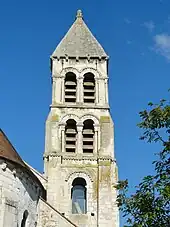 Le second et le troisième étage sont en grande partie identiques, ce qui contribue à l'harmonie du clocher, mais l'architecte a bien sûr évité une répétition pure et simple : des colonnettes d'angle munies de chapiteaux se substituent aux contreforts, et les deux étages sont séparés d'un bandeau formé par deux tores séparés d'un mince filet, en lieu et place du cordon de billettes. Les étages supérieurs sont ajourés, sur chaque face, de deux baies en plein cintre gémellées. Elles sont cantonnées chacune de deux colonnettes à chapiteaux, dont celles aux extrémités s'approchent de quelques dizaines de centimètres des contreforts : les baies occupent donc beaucoup de place, ce qui contribue à l'effet de légèreté mentionné ci-dessus. Les deux colonnettes centrales du premier étage ont les fûts accolés, et un peu plus minces que les autres. Il est à souligner que les fûts sont monolithiques, ou assemblés de deux longs segments, ce qui est loin d'être la règle, et augmente toujours l'élégance. Les chapiteaux sont tous à volutes d'angle, auxquelles s'ajoutent des palmettes de différents types, des feuilles simples et des motifs déjà observés sur les tailloirs. Du reste, les tailloirs ont toujours le même profil sommaire que les impostes des grandes arcades. Au second étage, les colonnettes d'extrémité d'un couple de baies et les colonnettes d'angle se partagent le même tailloir, et le biseau des tailloirs du second étage est garni de billettes. Les fenêtres sont légèrement plus larges, et les colonnettes centrales ne sont pas accolées, car il y a davantage de place grâce à l'absence des contreforts. Le second étage se termine par une corniche analogue à celle de la nef, mais les modillons sont irrégulièrement espacés et font nettement saillie devant le mur, ce qui est particulièrement bien visible aux angles. La pyramide servant de toit n'est pas ajourée, et sommée d'une sorte de fleuron[42].