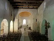 Le baron Bich formule justement le vœu de restituer l'état d'origine. Le sol de la nef est donc abaissé à son ancien niveau, de sorte que l'on doit descendre cinq marches après avoir franchi le portail, et dallé de pierre. Les fausses voûtes en berceau de la nef et des bas-côtés sont démolies, et les murs des bas-côtés sont ramenés à leur hauteur d'origine, légèrement plus faible. Lors de l'exhaussement des murs en 1878, les corniches des bas-côtés s'étaient perdues, en ne laissant subsister que quelques vestiges des tablettes : ces corniches doivent donc être entièrement refaites à neuf. Les tablettes imitent les éléments retrouvés, trop dégradés pour être conservés, alors que les modillons doivent être réinventés. Le sixième modillon au nord, en comptant depuis la droite, représente le logotype de la marque BiC, un bonhomme avec une pointe BiC. Au niveau de la nef et du chœur, seulement les éléments les plus dégradés des corniches ont besoin d'être refaits. Les fenêtres des bas-côtés datant du XVIIIe siècle sont bouchées, et à partir de deux piédroits et un linteau monolithique conservés, les quatre baies d'origine sont restituées. La nef reçoit une nouvelle charpente apparente conforme aux usages à la période romane. Tout l'intérieur est débadigeonné, puis un crépi est appliqué aux murs en moellons, dans le respect des techniques du Moyen Âge. Les fenêtres sont agrémentés de vitraux peints en grisaille. Les bancs, la chaire, les statues, les tableaux et une bonne partie du mobilier sont supprimés, en ne conservant que les autels, les fonts baptismaux, un lutrin et quelques petits objets. Désormais les fidèles prennent place sur des chaises. Des chandeliers sont accrochés à l'intérieur des grandes arcades, et complètent l'éclairage électrique, qui est complètement absente de la nef et limité au sanctuaire et aux bas-côtés, de sorte que les installations ne soient pas trop visibles[20].