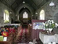 Les murs intérieurs de l'église sont enduits de plâtre. La nef, le chœur et les transepts comportent plusieurs fenêtres à lancette ou à remplage simple du XIXe siècle. Le chœur possède une banquette encastrée, une piscine et une niche-crédence. La fenêtre est du chœur est pourvue de vitrail. Les fonts baptismaux, probablement datés du XIIIe siècle, reposent sur une base du XIXe siècle. Les bancs, eux aussi datés du XIXe siècle[1], permettent d'accueilir jusqu'à 120 fidèles[8]. Par ailleurs, on trouve plusieurs prie-Dieu des années 1980[2].