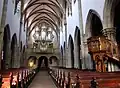 Le premier orgue date d’avant 1471, date à laquelle les livres de comptes mentionnent la réparation d’un tel instrument. Un autre orgue est construit en 1619, mais se révèle être de piètre qualité. Il est par conséquent remplacé en 1748 par l’orgue de l’ancienne église des Dominicains de Strasbourg, qui montre à son tour de sérieux problèmes. L’instrument fait ainsi l’objet d’importantes réparations par Jean André Silbermann en 1760, puis par Callinet quelques décennies plus tard. Comme les cloches, cet orgue est victime des besoins en métaux de l’industrie militaire pendant la Première Guerre mondiale et est dépouillé de la majeure partie de ses tuyaux métalliques en 1917. Un nouvel orgue est donc construit en 1933 par l’entreprise Blanarsch avec les restes de l’ancien[11]. Gravement endommagé par les bombardements de la Seconde Guerre mondiale, l’orgue est restauré en 1955 par la maison Roethinger[12].