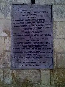À l’intérieur, sur le mur est du bras sud du transept, une plaque de marbre (100 cm x 50 cm) rappelle les bienfaits du marquis Étienne Louis Antoine Guinot de Monconseil (1695-1782), le personnage célèbre de la commune. Selon le livre de Robert Colle[3], le blason, que l'on a du mal à discerner, qui se trouve au-dessus du sommet du portail de l'église et au pied de la croix, est son blason.